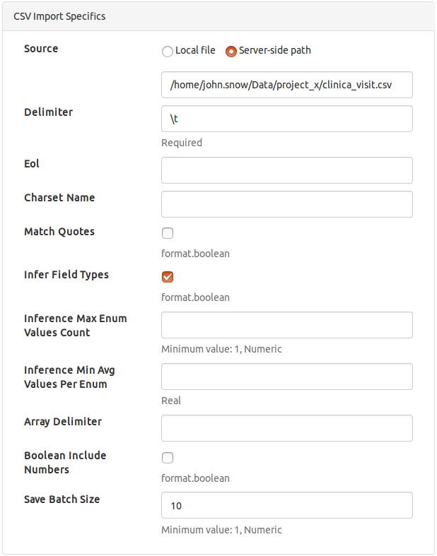 - Infer Field Types must be checked if field types are supposed to be inferred from the column values. Warning: if unchecked ALL fields/columns are considered to be Strings.